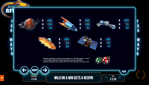 The reel table is cast against a background that is thick and stark dark. Remember we are in space already and in the environment where asteroids are known to be. You really cannot any other thing in the background except the pitch blackness that the background is in. the reel table in this game is quite different from the reel tables in most slot games. This is not the kind of table structure you may be used to. The table is in 3x4x5x4x3 formation. The architecture of the table gives the slot game a rare kind of beauty. At the left top of the reel table sits the name of the slot game. The 3x4x5x4x3 table formation gives makes the whole reel table look like a foldable pamphlet. The symbols are different colours that blend well with the colour of the background. The symbols in this game are represented by the different traditional card symbols, a spacecraft, a planet like symbol and the wild represented by the word wild written in a bold font. This slot game has an RTP of 95.00%.